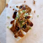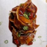 Thin Rice noodle rolls with Sweet soy, Sesame Peanut sauce, Hoisin sauce, Crispy shallots, Sesame seeds and Spring onions